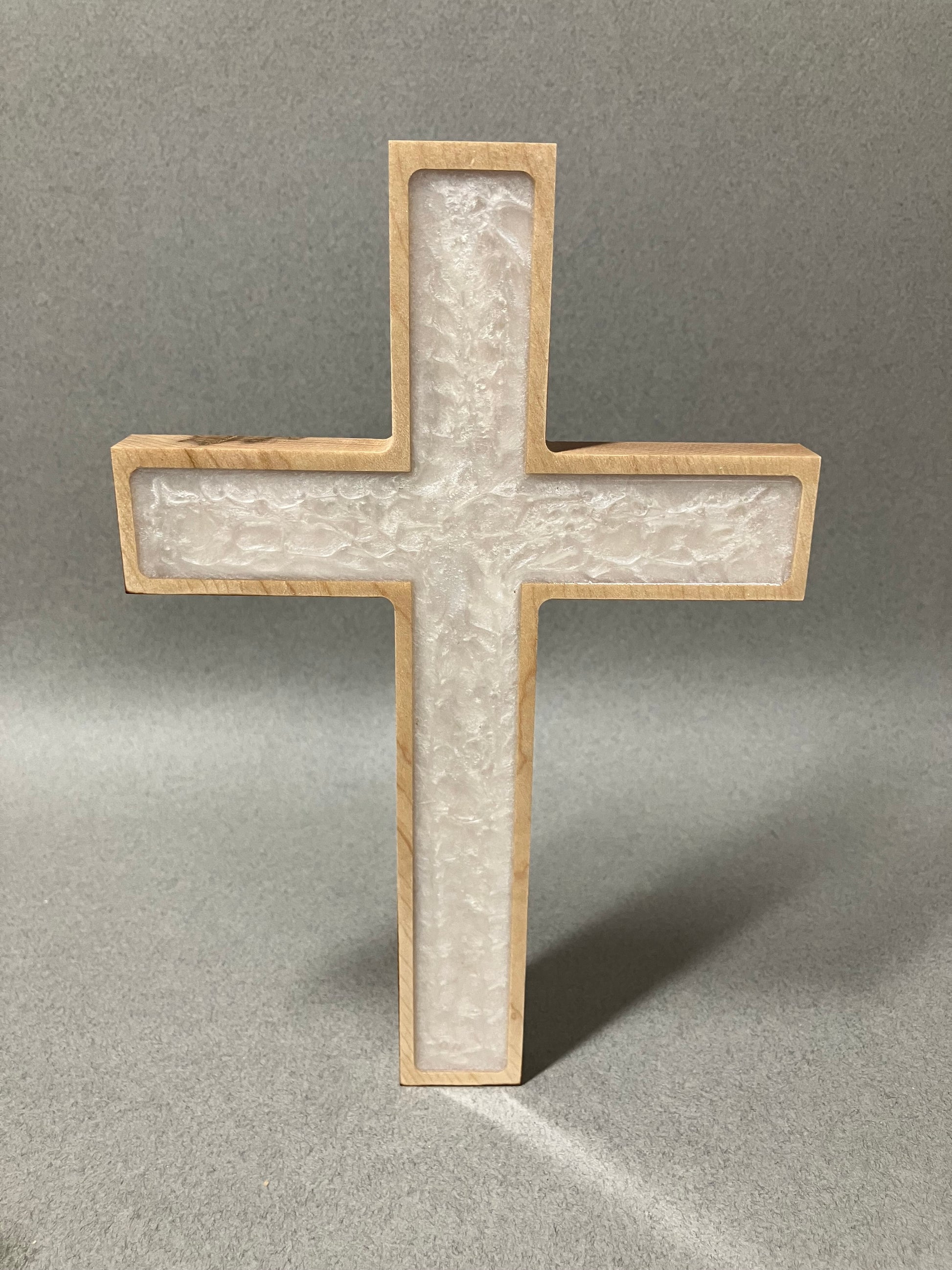 Beautiful solid hard Maple cross with a pearl epoxy inlay and square corners. Each cross is unique, made to order and crafted in America using only American products.