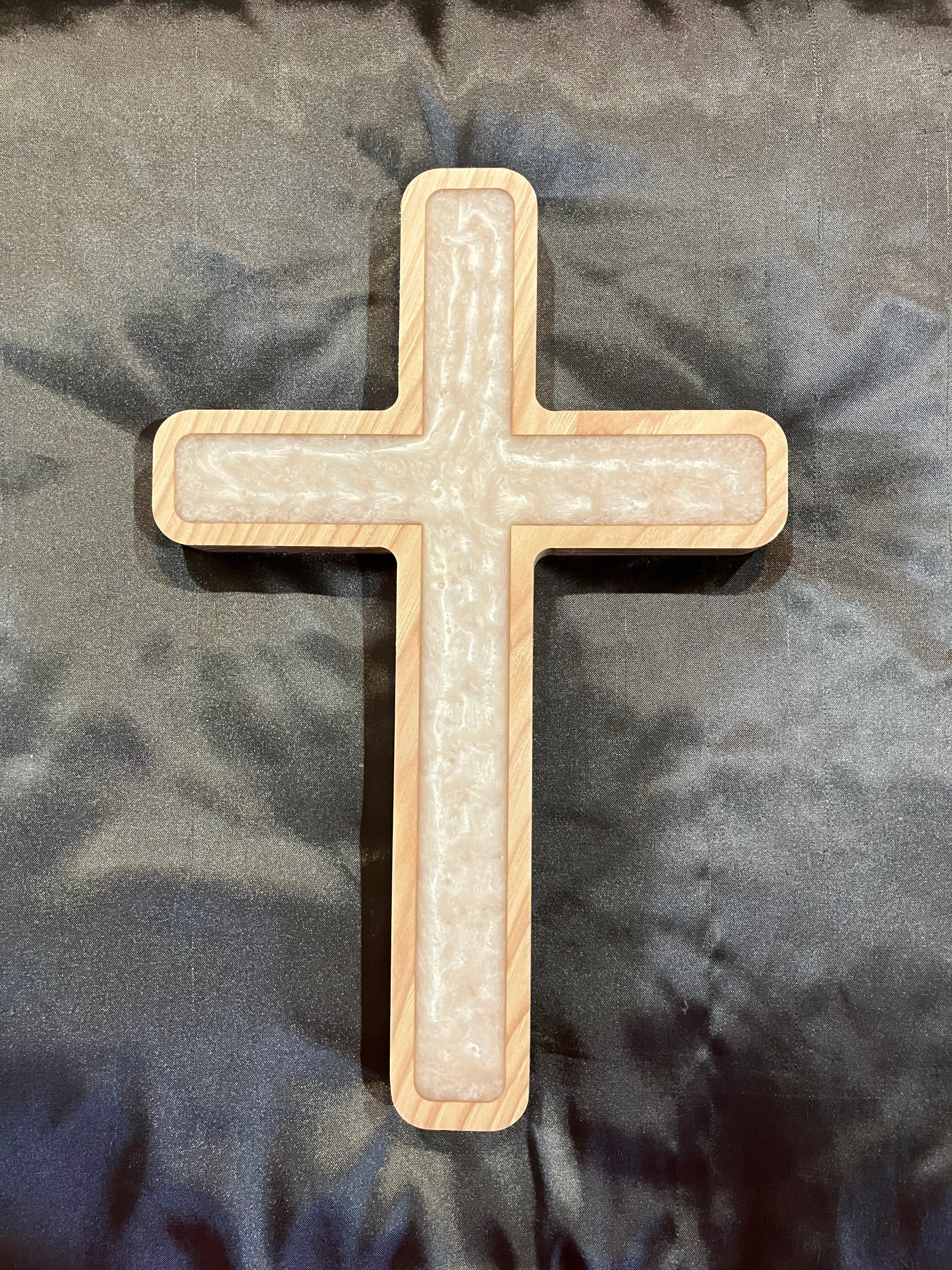Beautiful solid wood white ash cross with pearl epoxy inlay and rounded corners. Each cross is unique, made to order and crafted in America using only American products.