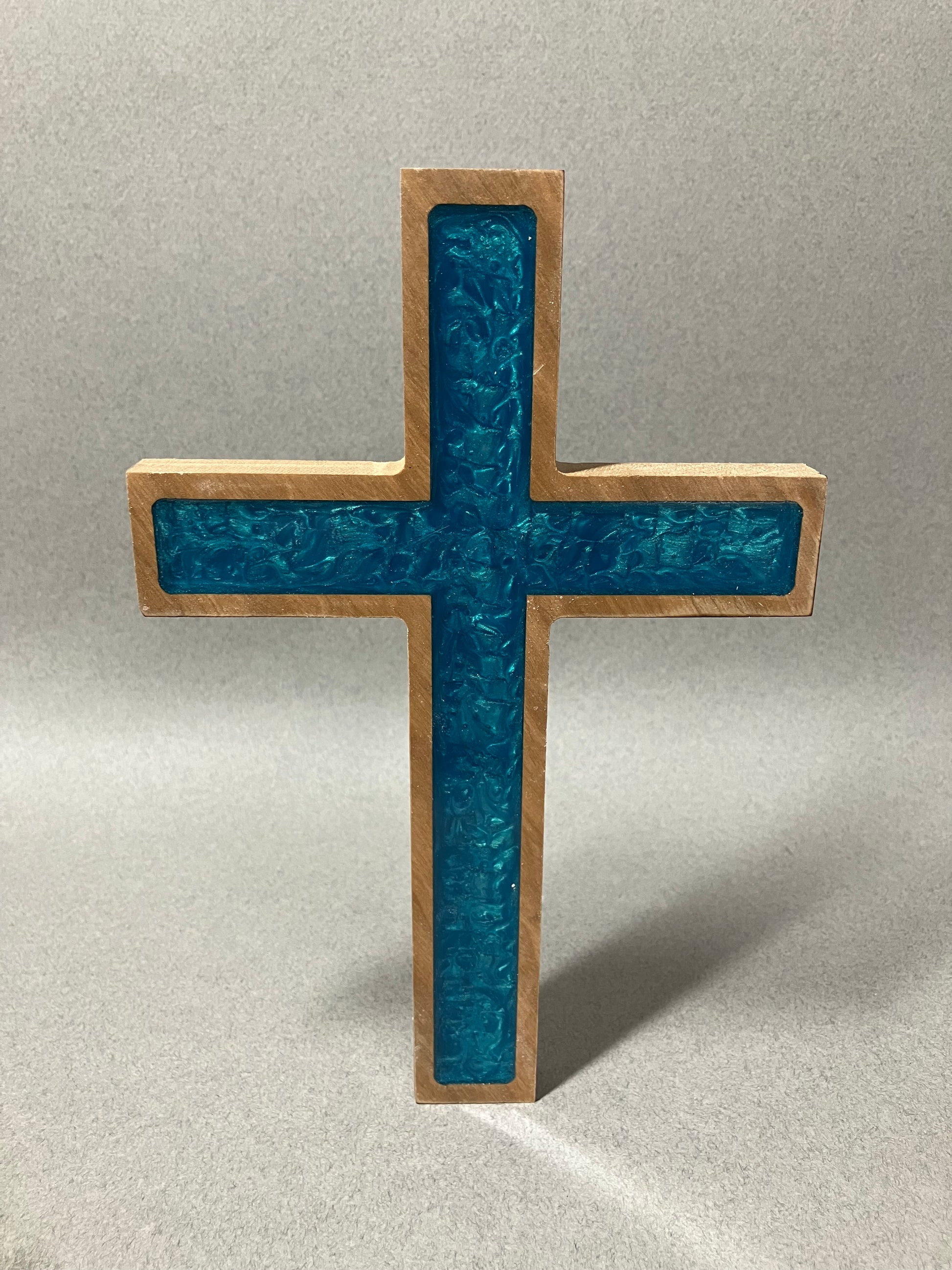 Beautiful solid Pecan/Hickory cross with aqua epoxy inlay and square corners. Each cross is unique, made to order crafted in America using only American made products!