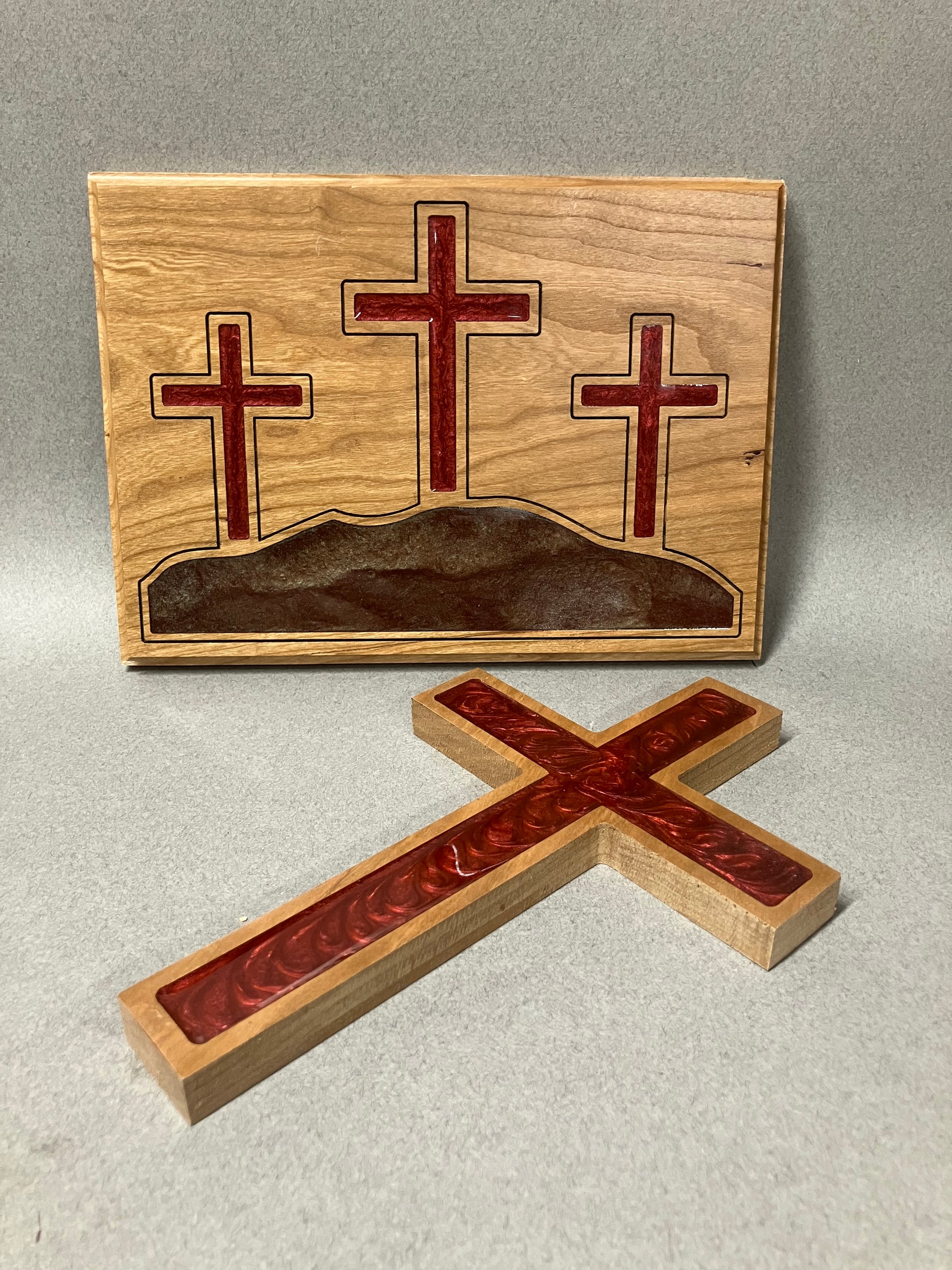 The best of both! Our solid cherry wood large cross along with the three crosses on a hill. The plaque is red inlayed epoxy crosses highlighted in black on a hill. The hill is an earthy colored mink epoxy with deep brown, gold and greens. The plaque and cross are solid cherry wood with a satin finish.